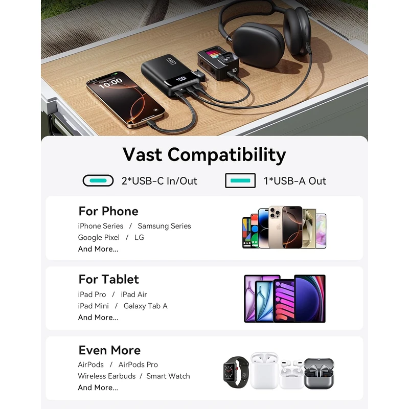 Built for long days and heavy device use with a powerful 20000mAh capacity and advanced 22.5W fast charging. Features an LED power display and USB C in and out functionality for smooth charging on the go. Ideal for users who need reliable, high capacity energy for phones, tablets, and accessories.