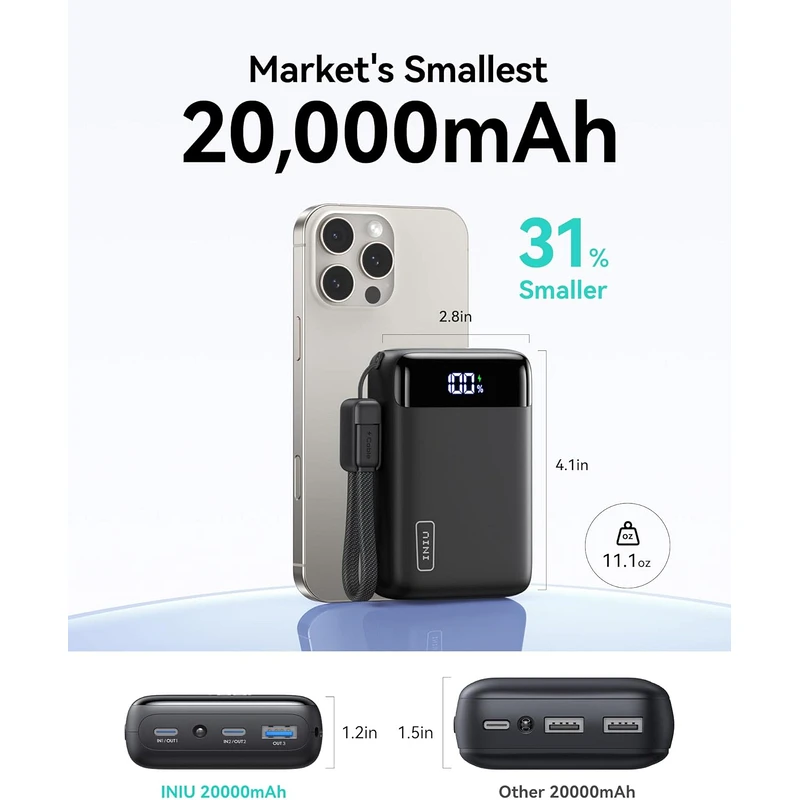 The INIU 20000mAh fast charging power bank delivers exceptional endurance while maintaining a compact and travel ready build. Equipped with PD 3.0 and QC 4.0 technology, it provides rapid and stable performance for a wide range of devices.