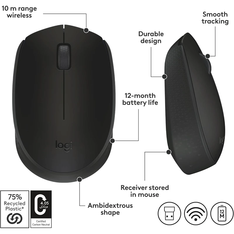 The Logitech M170 provides dependable wireless performance in a compact and comfortable design. With simple USB receiver setup and efficient battery usage, it ensures seamless navigation whether working at home, in the office, or while traveling.